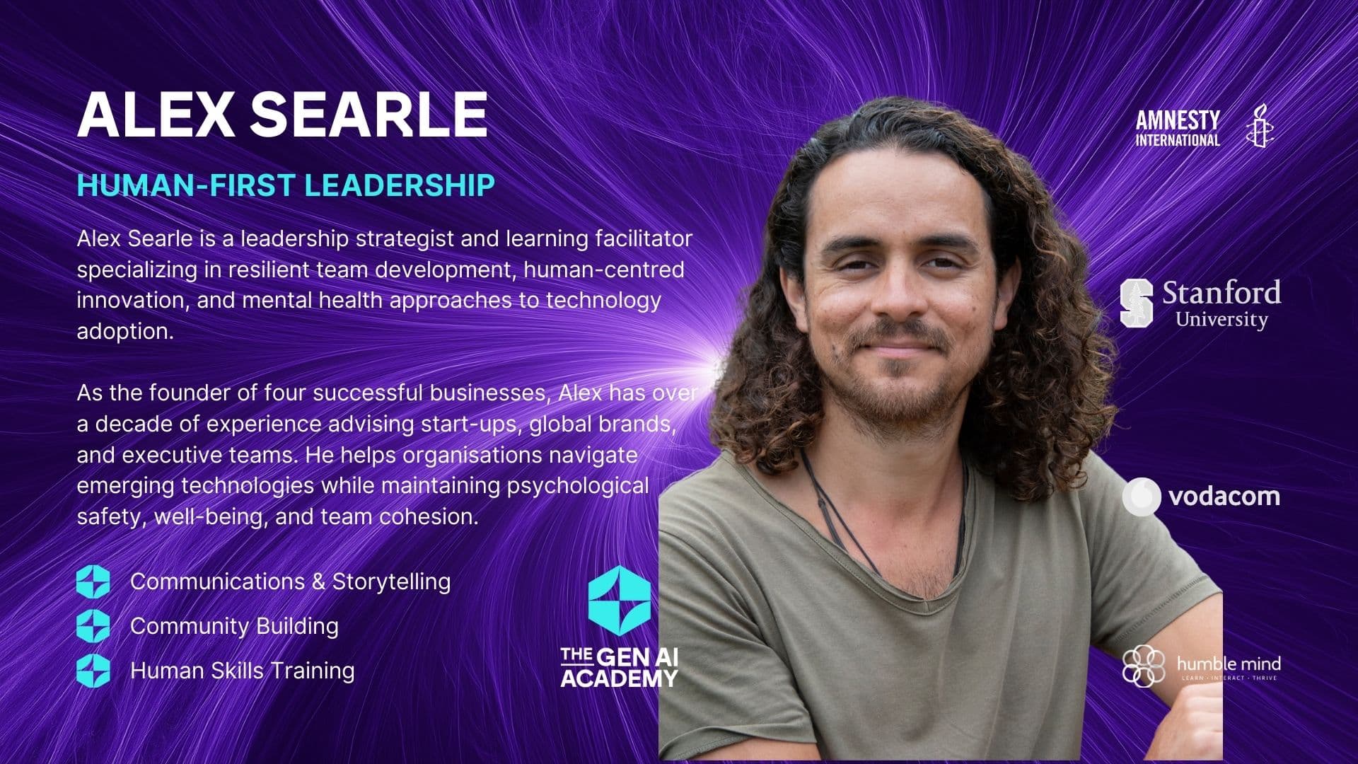 Alex Searle é estrategista de liderança e facilitador de aprendizagem especializado em desenvolvimento de equipas resilientes, inovação centrada no ser humano e abordagens de saúde mental para a adoção de tecnologia.