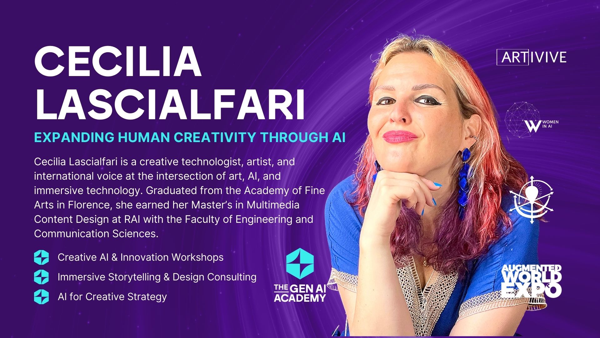 Cecilia Lascialfari é uma tecnóloga criativa, artista e voz internacional na intersecção entre arte, IA e tecnologia imersiva. Formada pela Academia de Belas Artes de Florença, obteve o mestrado em Design de Conteúdos Multimédia na RAI (Radio Televisão Italiana) pela Faculdade de Engenharia e Ciências da Comunicação.