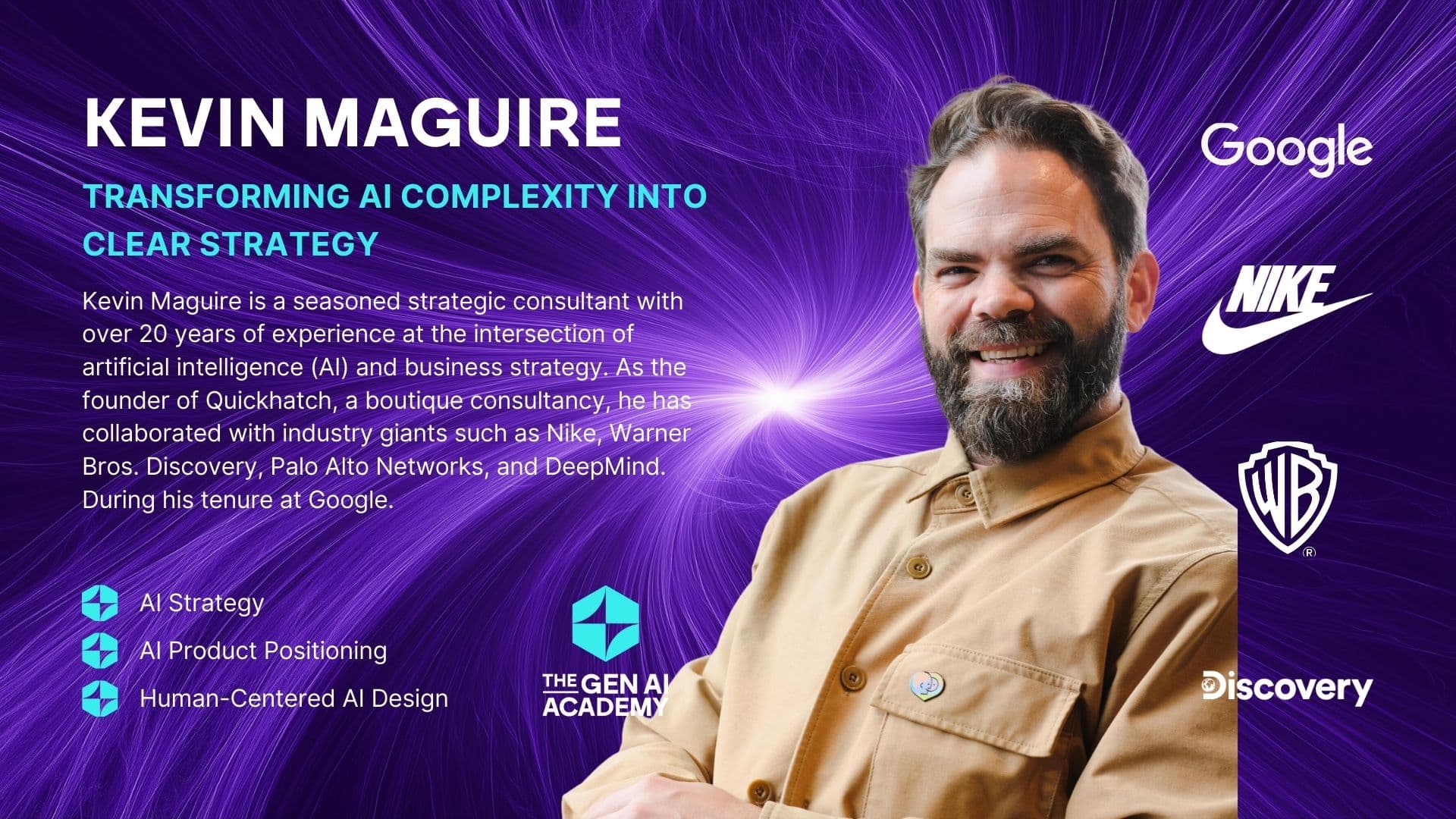 Kevin Maguire é um consultor estratégico experiente, com mais de 20 anos de experiência na intersecção entre inteligência artificial (IA) e estratégia empresarial. Como fundador da Quickhatch, uma consultoria boutique, colaborou com gigantes da indústria, como Nike, Warner Bros. Discovery, Palo Alto Networks e DeepMind. Durante o seu mandato na Google.