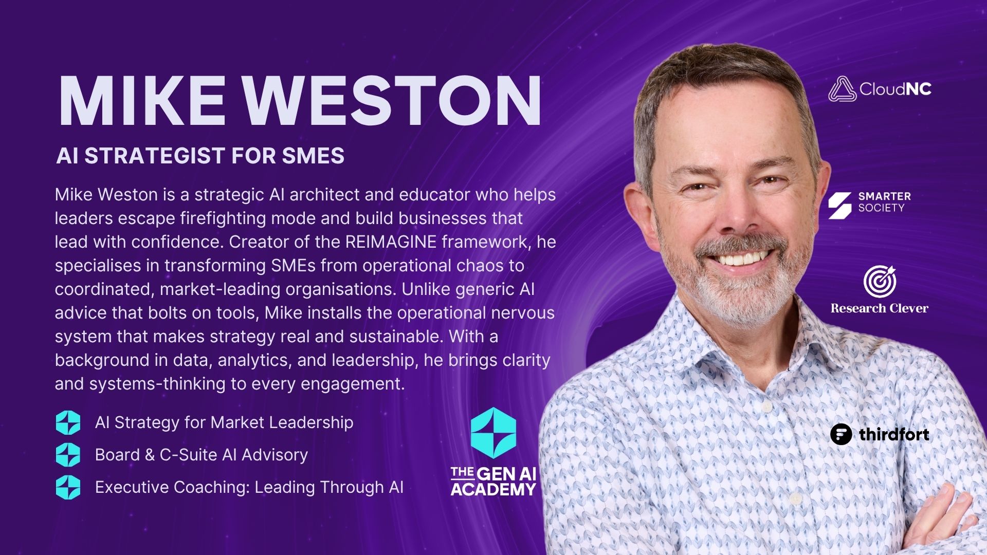 Mike Weston é estrategista, educador e arquiteto estratégico de IA que ajuda os líderes a deixarem de ser os bombeiros mais caros da sua empresa. Com décadas de experiência em dados, análise e liderança, ele compreende os custos ocultos da gestão reativa — e a vantagem competitiva de se libertar dela.