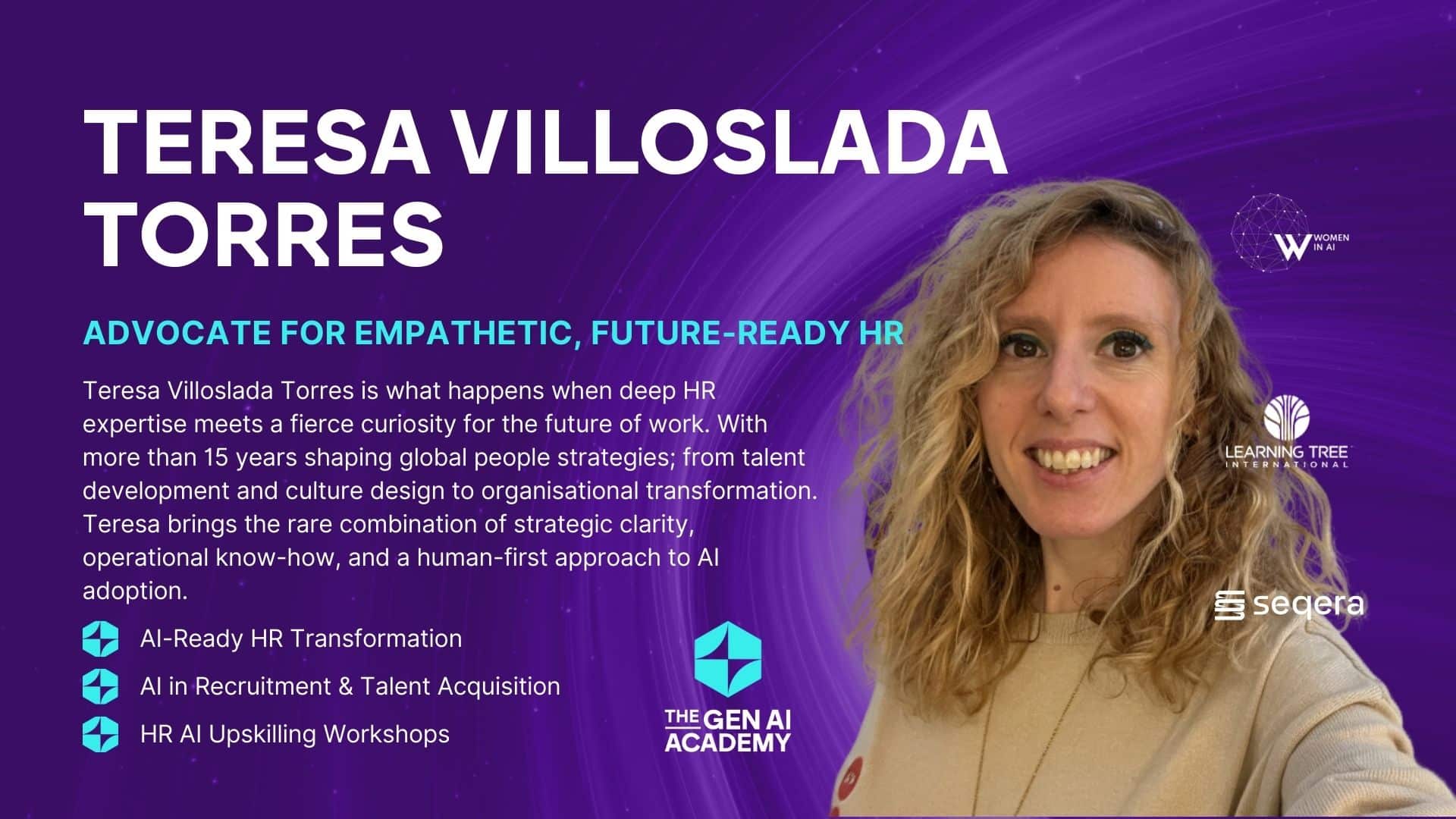 Teresa Villoslada Torres é o resultado da combinação de um profundo conhecimento em RH com uma curiosidade feroz pelo futuro do trabalho. Com mais de 10 anos de experiência no setor de tecnologia, Teresa possibilitou, desde o desenvolvimento de talentos e o design cultural até a transformação organizacional. Teresa traz uma combinação rara de clareza estratégica, know-how operacional e uma abordagem que prioriza o ser humano para a adoção da IA.